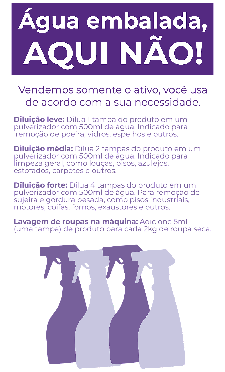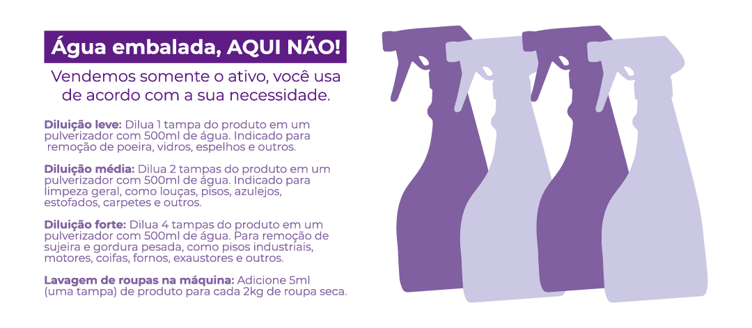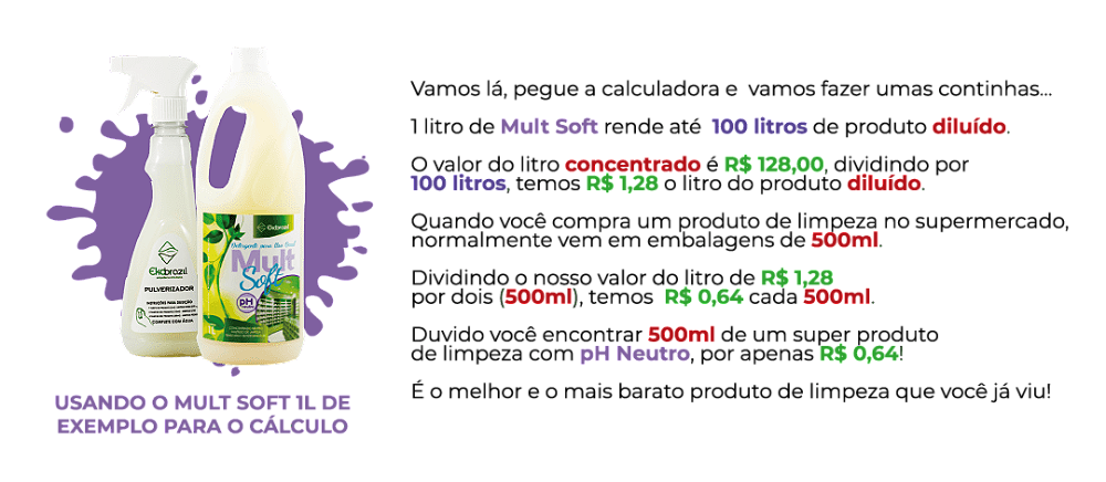 Pensando na preservação ambiental, nossos produtos são ecologicamente corretos e biodegradáveis, ou seja não agridem a natureza e os usuários. Por serem concentrados, evitamos colocar na natureza diversas embalagens plásticas. Por exemplo: 1 litro do Mult Soft rende até 100 litros, portanto, se diluído em 500ml, deixamos de colocar no ambiente 199 embalagens, 199 tampas e 199 rótulos,considerando que pulverizador de 500ml.